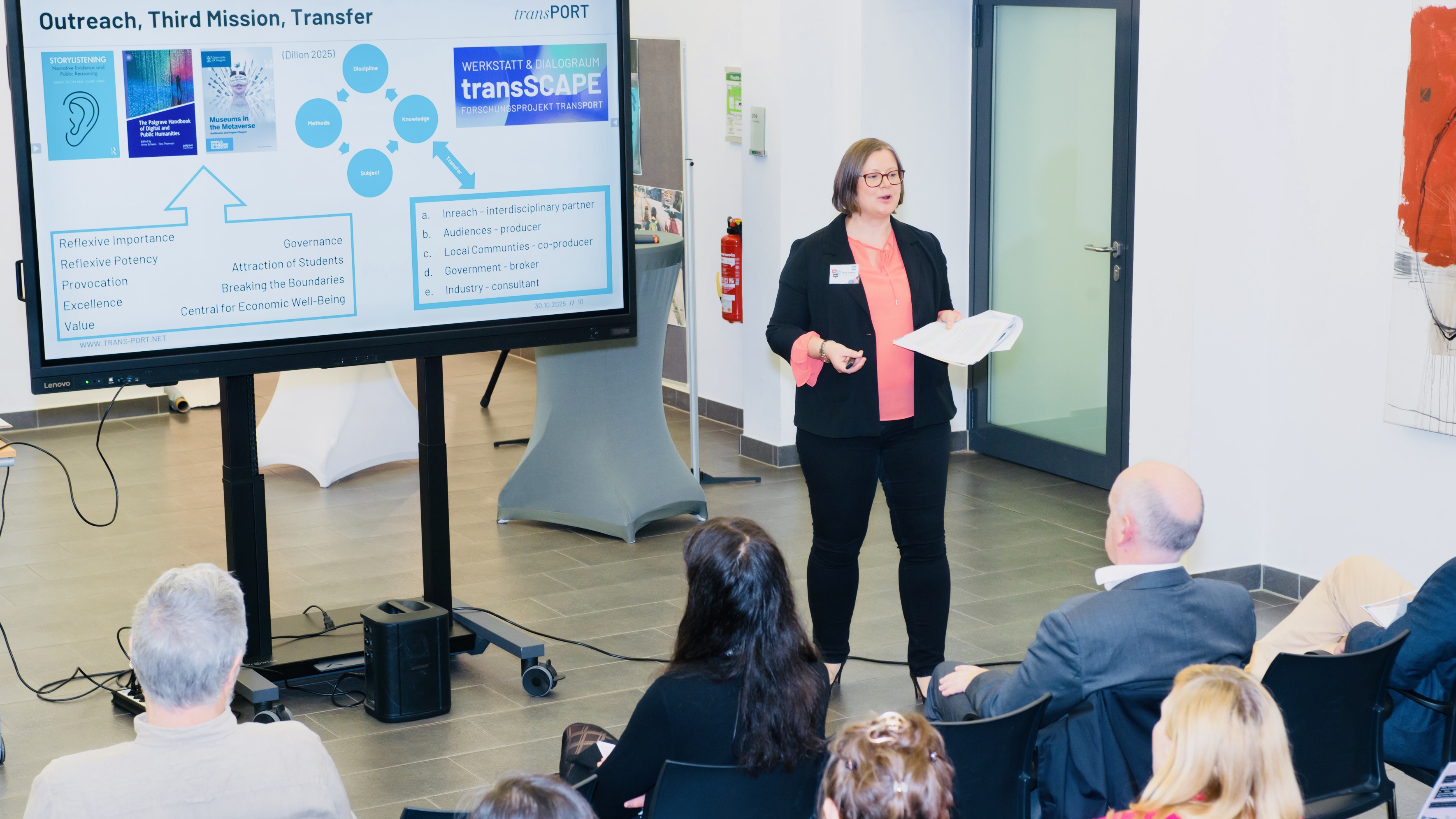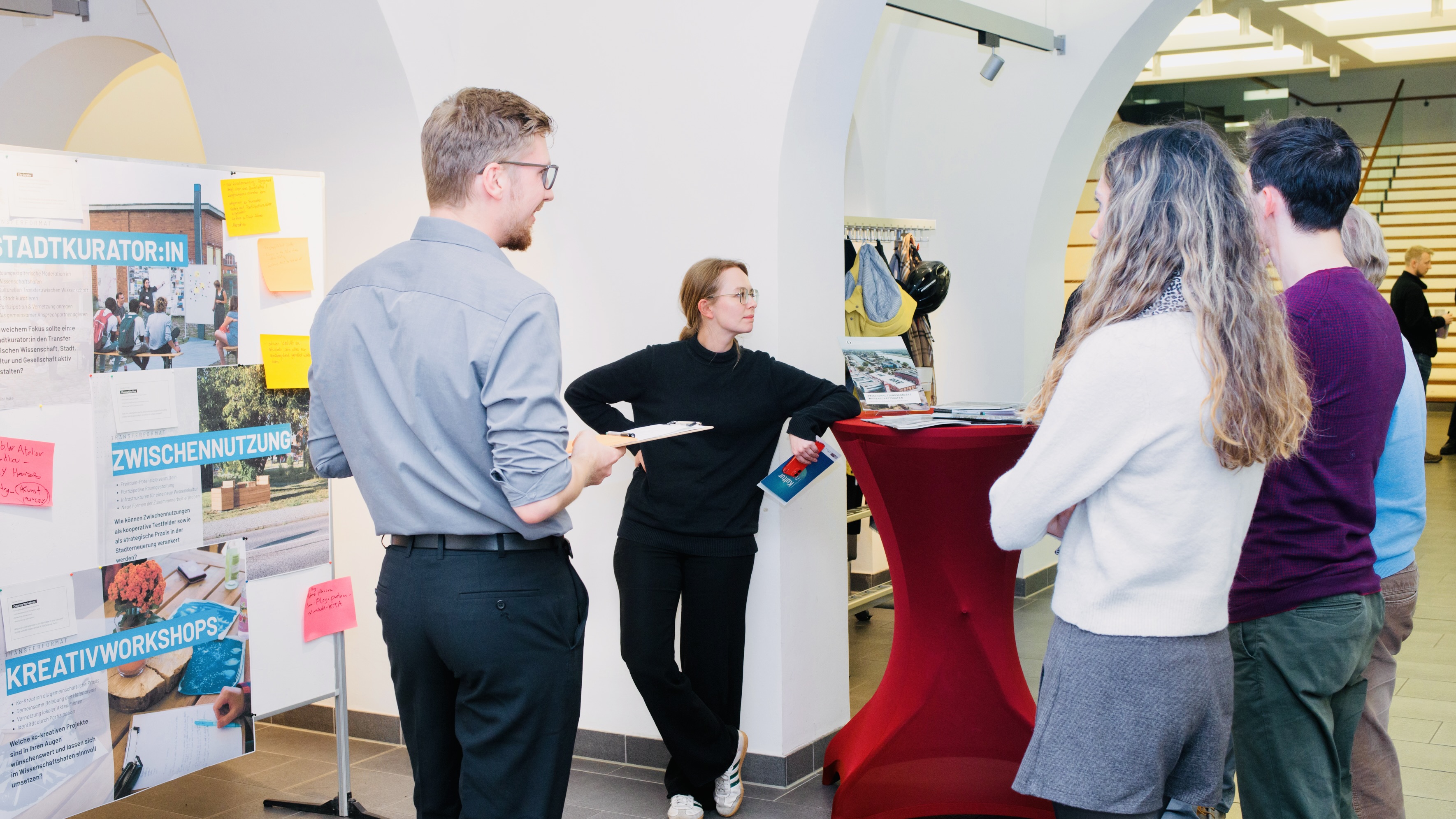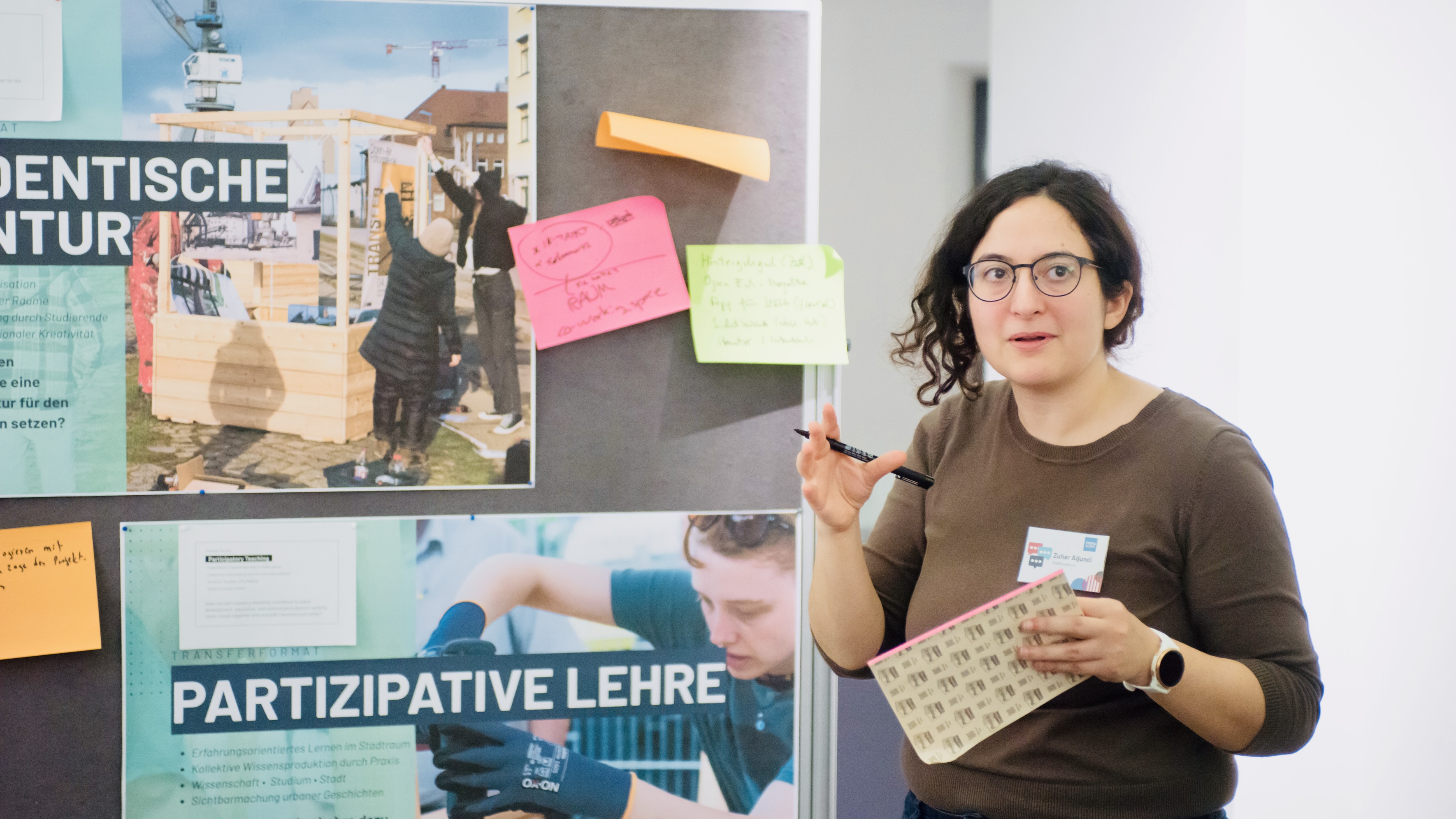 Danach konnten die Teilnehmer:innen Transferformate im direkten Austausch erleben. Beim Mini Walk & Talk führte ein Wissensparcours durch verschiedene Transferprojekte, die in der transSCAPE-Werkstatt vorgestellt wurden – von ko-kreativen Workshops über Tools für Schulen bis hin zu einer studentischen Agentur.